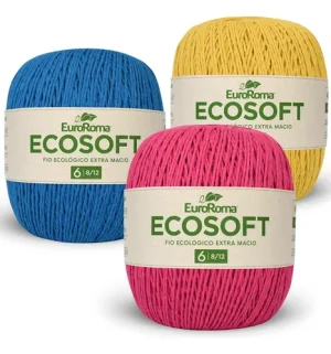 O Barbante EuroRoma Ecosoft Nº 6 oferece excelente rendimento e uniformidade na espessura. Com composição mista de algodão e fibras têxteis recicladas, possui torção média e toque macio, ideal para trabalhos em crochê, tricô e tecelagem. O título 8/12 indica 8 cabos torcidos em espessura padrão 12, garantindo robustez sem comprometer a leveza das peças.