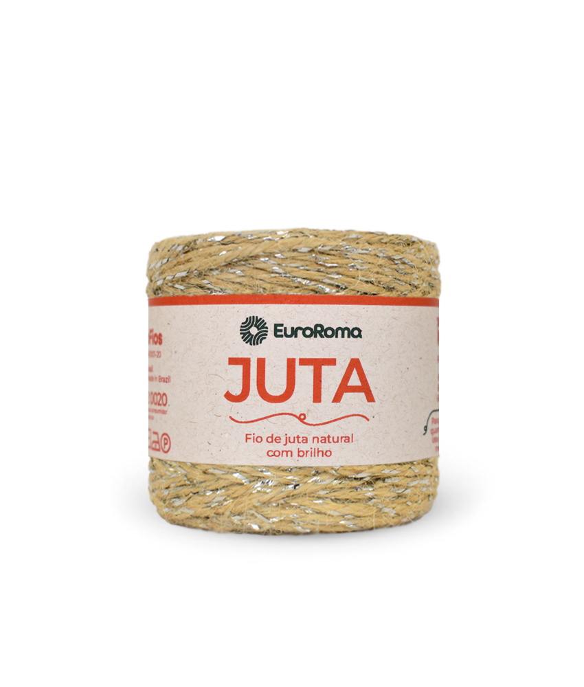 Este fio rústico e ao mesmo tempo super charmoso, é composto pelo entrelaçamento do fio de juta com uma fita metalizada prata. É perfeito para dar aquele acabamento especial em embalagens, arranjos florais, criar peças de macramê mais delicadas e para enriquecer seus detalhes, também pode ser usado para trabalhos em crochê como sousplat e acessórios. Sua espessura é semelhante a um fio nº 6. A juta é uma fibra têxtil vegetal, orgânica e biodegradável.