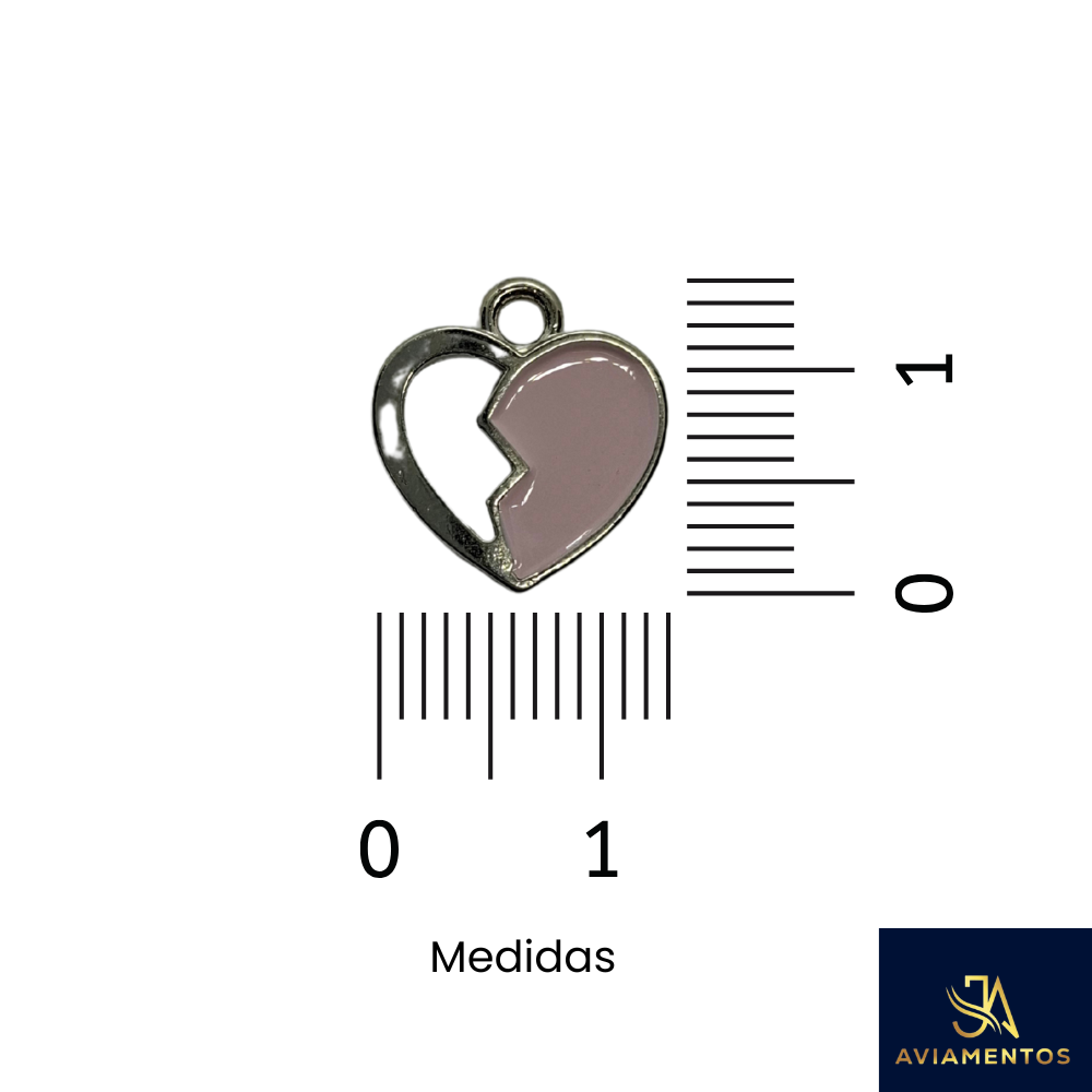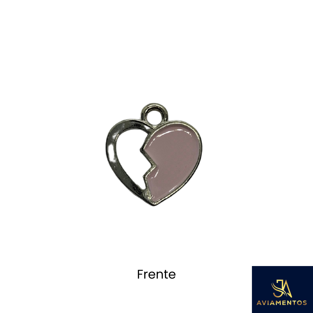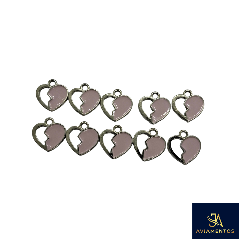 Kit 10 Pingentes Coração Partido 13x14mm – Metal Prateado com Resina Rosa
